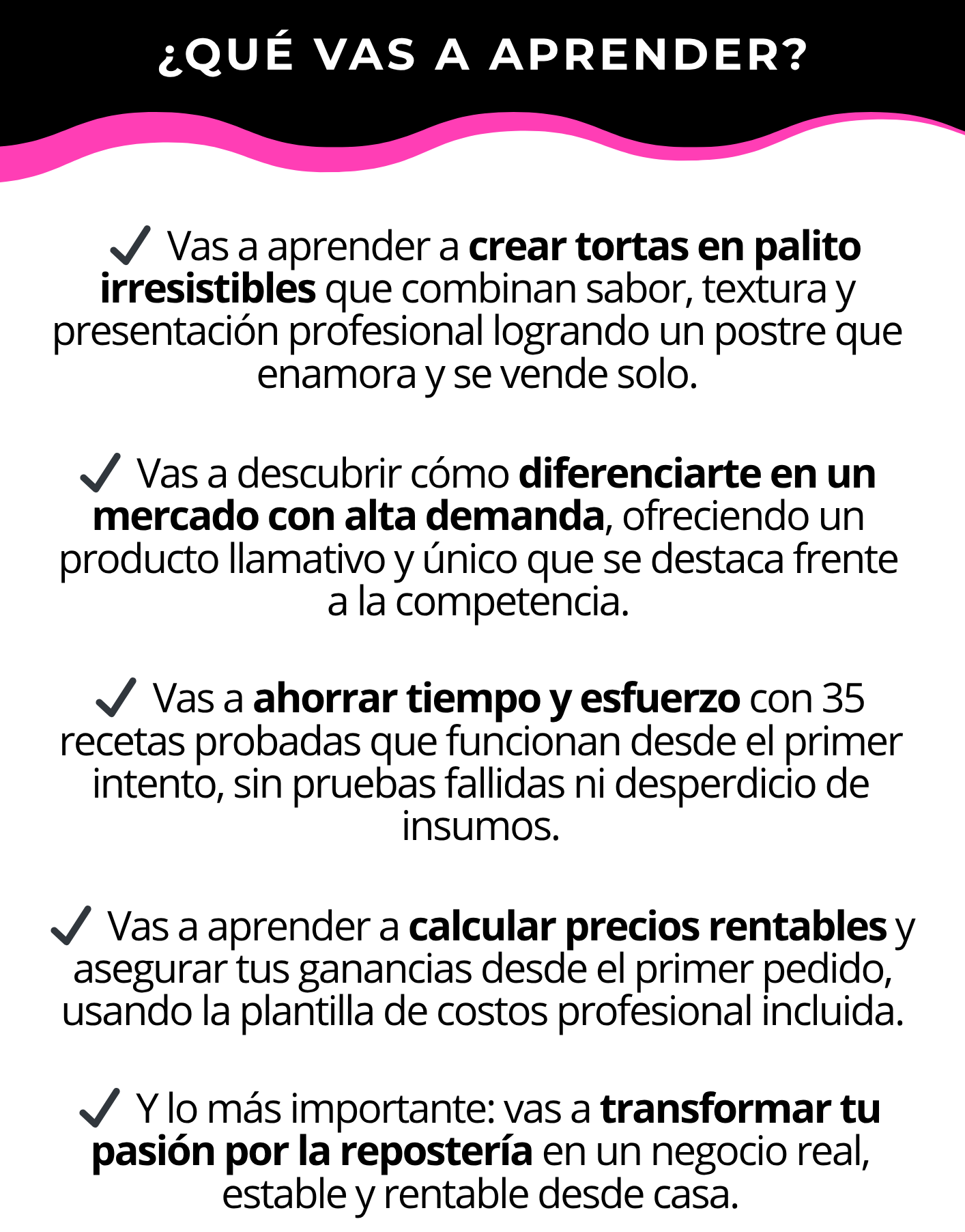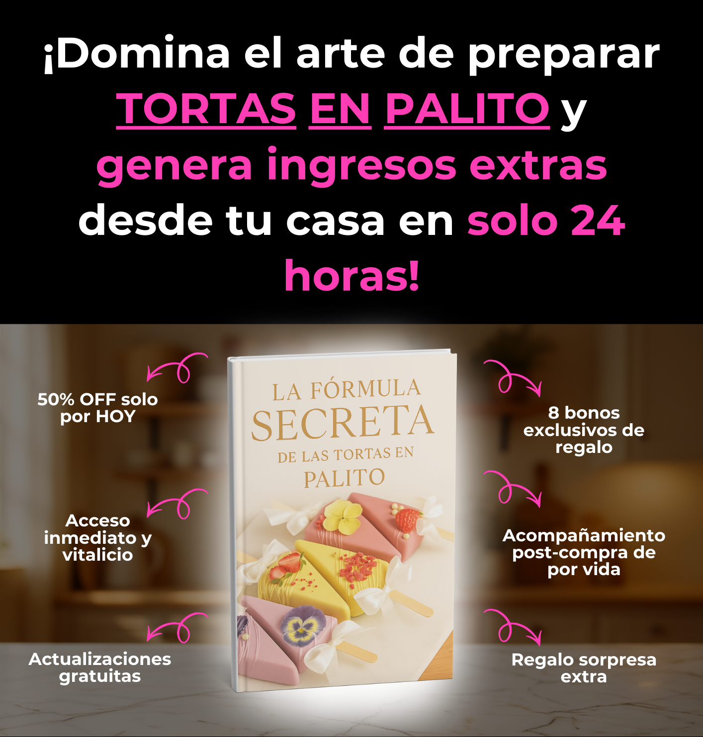 Incluye un recetario digital con 35 recetas de Tortas en Palito para que aprendas paso a paso a crearlas con facilidad.
